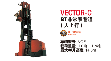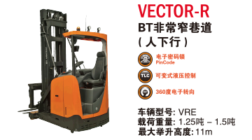 優(yōu)化存儲空間利用率,BT非常窄巷道叉車VECTOR系列人下型車VECTOR-R為橫向托盤搬運提供高效解決方案,人上型車VECTOR-C為全托盤搬運和高位揀選提供高效解決方案。以上兩種作業(yè)皆為窄通道內(nèi)作業(yè),最高可舉升到14.8m,剩余承載能力可以保持在1.5t。在窄通道內(nèi)確保作業(yè)的機動性,最小通道寬度可達(dá)1460mm。這些全能叉車可選擇配置導(dǎo)軌或是電線。每一輛BT VECTOR系列叉車都能在確保駕駛安全性和舒適性的同時,為客戶提供卓越的性能。VNA較其他密集存儲方式實現(xiàn)了對所有托盤位的直接和高效存取,同時更窄的通道寬度較前移式叉車實現(xiàn)了更高的空間利用率。對于擁有較多存儲單位,且周轉(zhuǎn)率較高的冷庫客戶而言,是高效密集存儲的最理想解決方案。