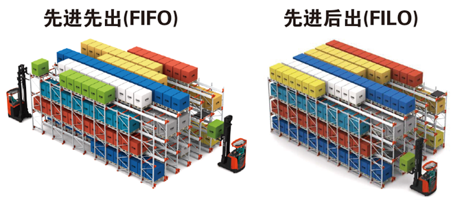 如留有叉車駛?cè)胪ǖ?,則可實現(xiàn)先進先出的存儲方式(FIFO)